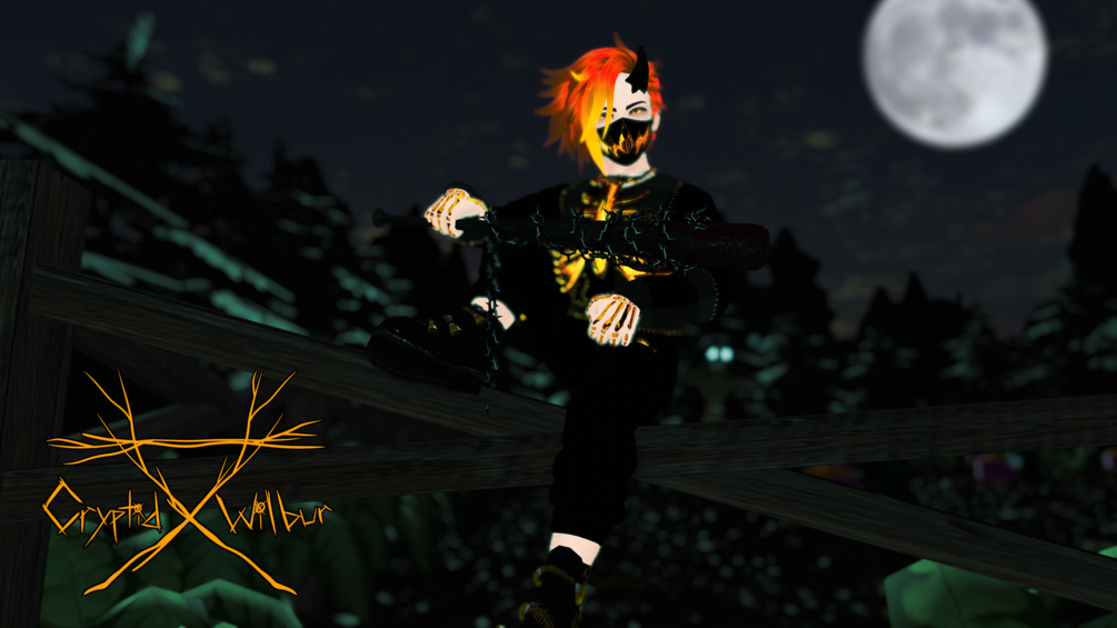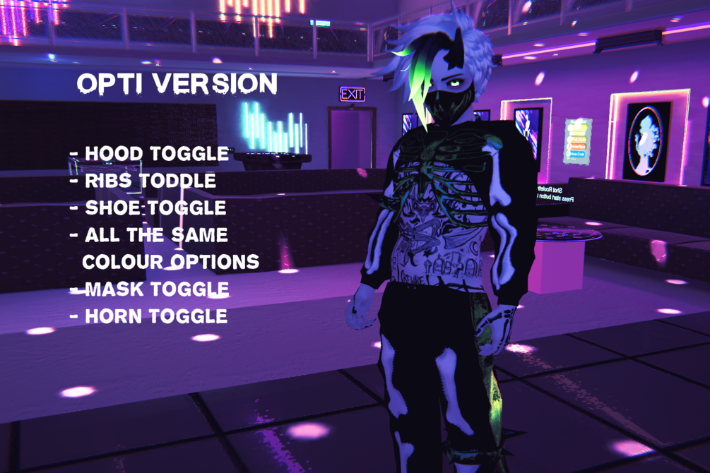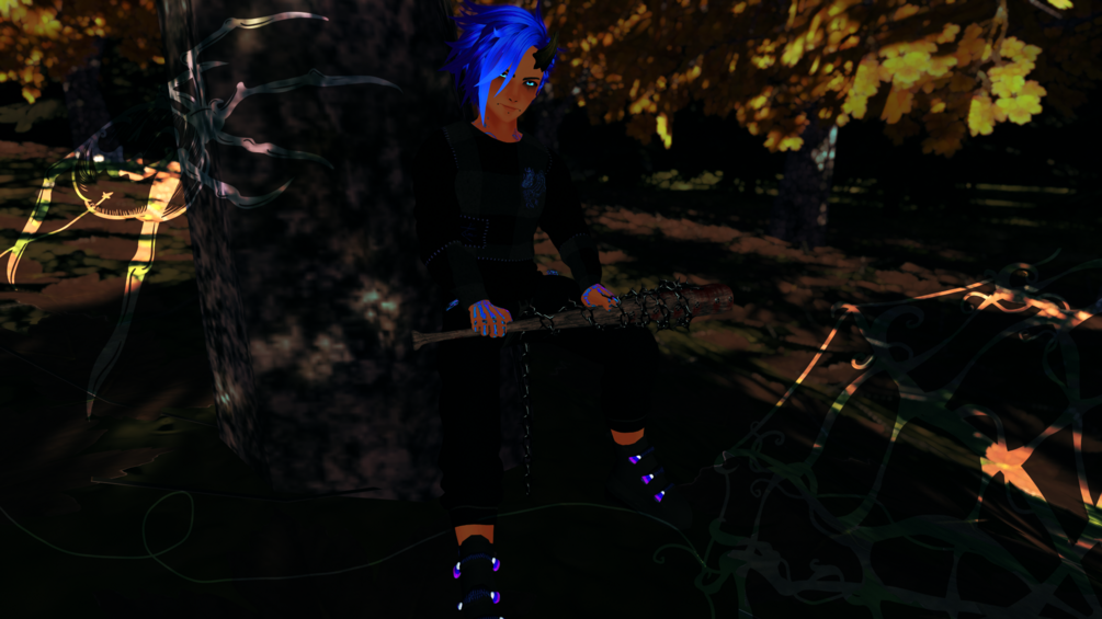 He has Audiolink tattoos, an Audiolink melting bead necklace, kandi jewelry, barbed wire, and pumpkin vine tail, pumpkin stem horn, clothing options, outter ribcage, a bat, a bean bag chair with different blankets, and clap effects.