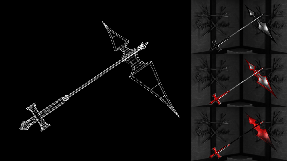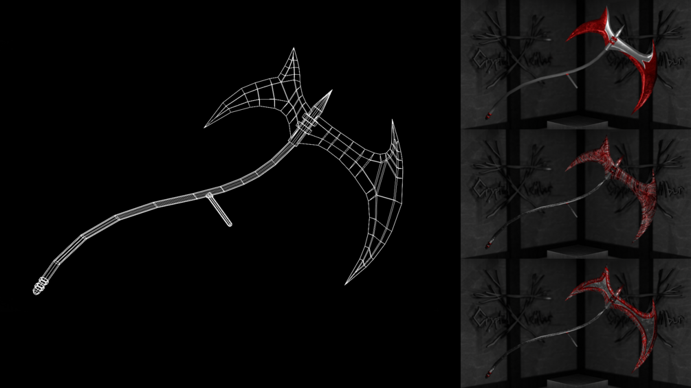 Advent HowlendarTwo scythes, one more Gothic and then one more practical, with a curved shape and side grip.